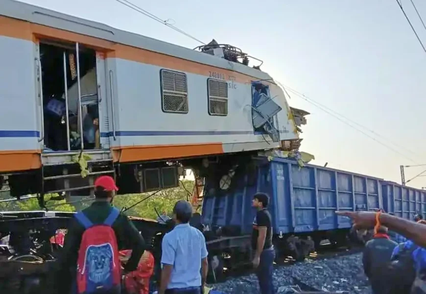 The local passenger train hit the goods train from behind, senior government official Sanjay Agarwal told The Associated Press, adding that a coach ended up on top of a wagon of the goods train.
