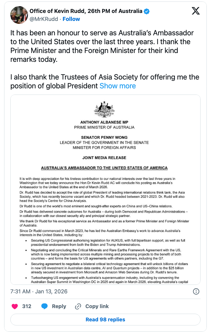 There is no reason to disbelieve Albanese when he says Rudd's decision to leave early was his own. Rudd and the Albanese government had ridden out the worst of the bumps his past mouthings-off had caused in relations with the Trump administration.