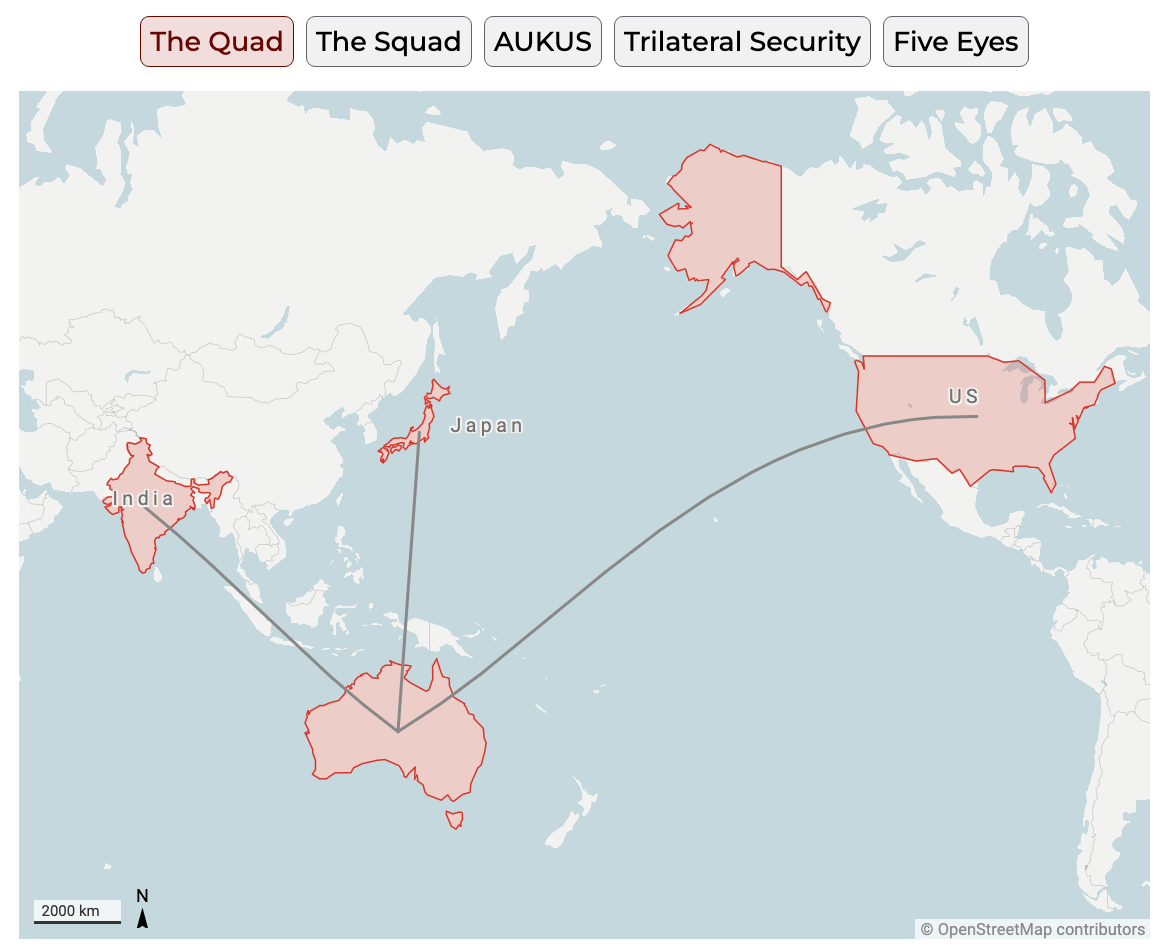 - the Quad (Australia, US, Japan, India) and emerging "Squad" (Australia, Japan, Philippines, US)