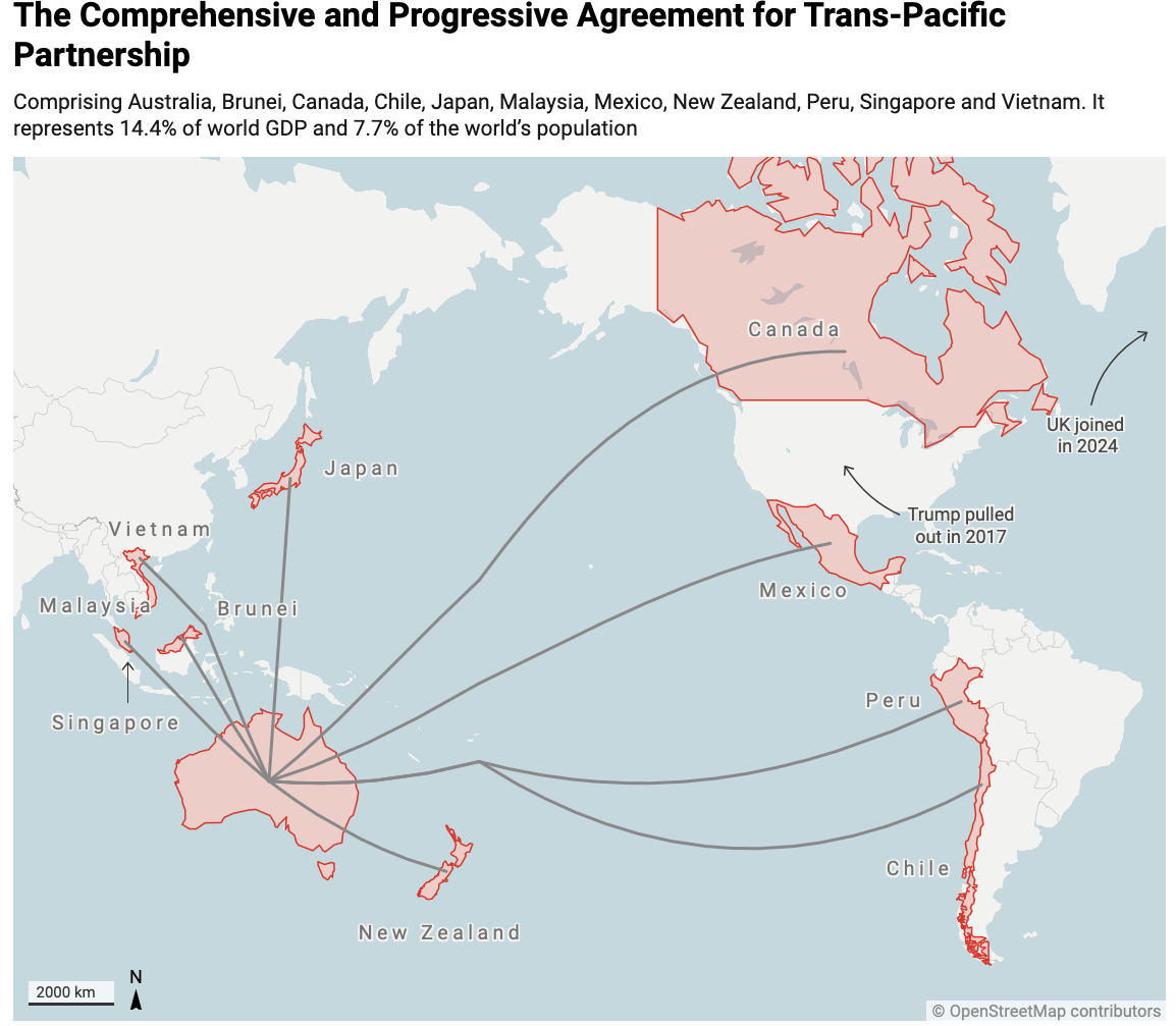This is a free-trade agreement originally for Pacific Rim countries, comprising Australia, Brunei, Canada, Chile, Japan, Malaysia, Mexico, New Zealand, Peru, Singapore and Vietnam. (Trump pulled the US out in 2017.)