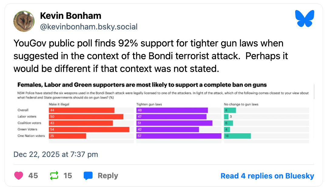 In a post-Bondi YouGov national poll that was conducted December 15-22 from a sample of 1,509, 44% wanted personal guns like those used in the attacks made illegal, 48% wanted tighter gun laws and just 8% wanted no change to gun laws. By 81-19, respondents thought Ahmed al Ahmed, who disarmed one of the Bondi gunmen, deserved to be made Australian of the Year.