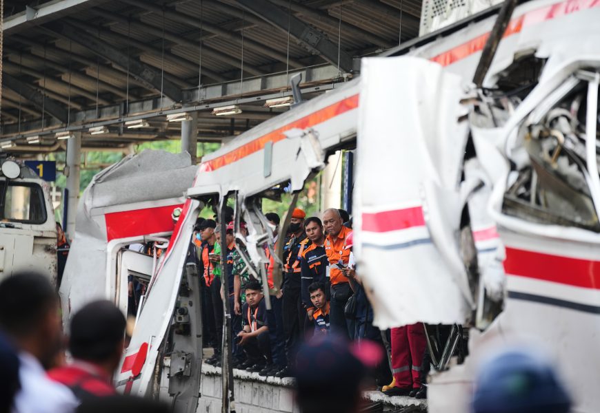 The Argo Bromo Anggrek long-distance train crashed into the rear car of a commuter train that was stopped at Bekasi Timur Station. The car had been designated for women only, a common accommodation to help avoid harassment. Rescue teams worked to reach five passengers trapped in the damaged commuter train car.