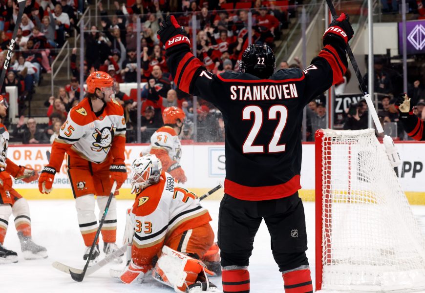Granlund shot wide through the crease on an open net, but pretty much stayed in the same position and then tapped in a pass from Mason McTavish for the Ducks' 2-1 lead with 6:42 left in the second. Stankoven scored for the third game in a row, taking a pass from Taylor Hall on a two-man rush to pull the Hurricanes even.