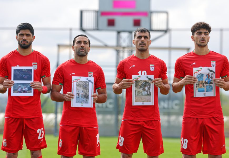 The Iran players were joined by coach Amir Ghalenoei, Iran Football Federation vice president Mehdi Mohammad Nabi and staff members, holding the photographs while singing the national anthem.