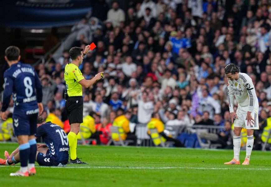 Defender Carreras was sent off in stoppage time in Madrid’s 2-0 home loss against Celta Vigo, a match in which the hosts finished with nine men as Fran García had already been shown a red card.