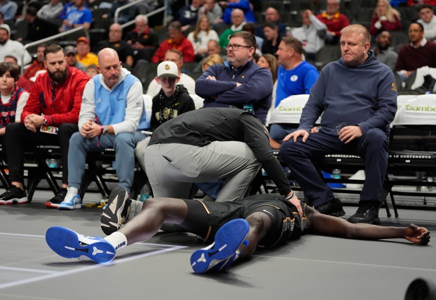 KANSAS CITY, Mo. (AP) – UCF’s John Bol fell to the floor clutching his chest and the 7-foot-2 sophomore from South Sudan had to be helped to the locker room during the second half of the Knights’ game against Arizona in the Big 12 Tournament on Thursday.