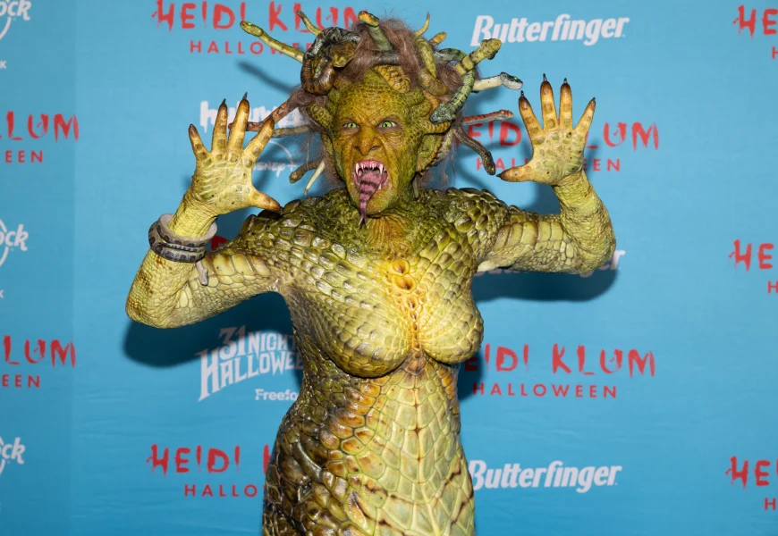 NEW YORK (AP) – Heidi Klum donned green scales and squirming snakes to transform herself into Medusa for Halloween on Friday.