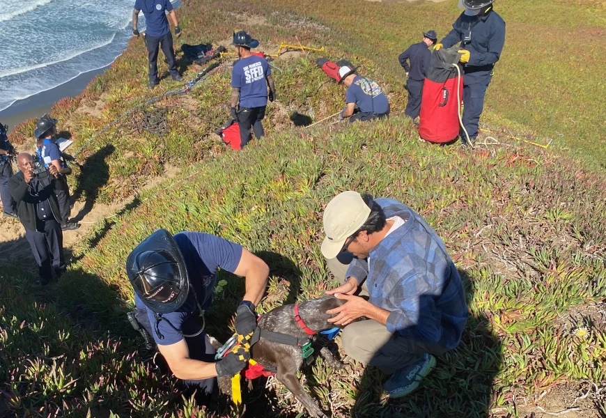 Firefighters sent a team to retrieve the canine, which had found temporary refuge on a ledge about 40 feet (12 meters) below the top of the cliff. A San Francisco police drone operator who happened to be in the area heard the emergency call go out and captured an aerial view of the dog’s location, which he relayed to firefighters.