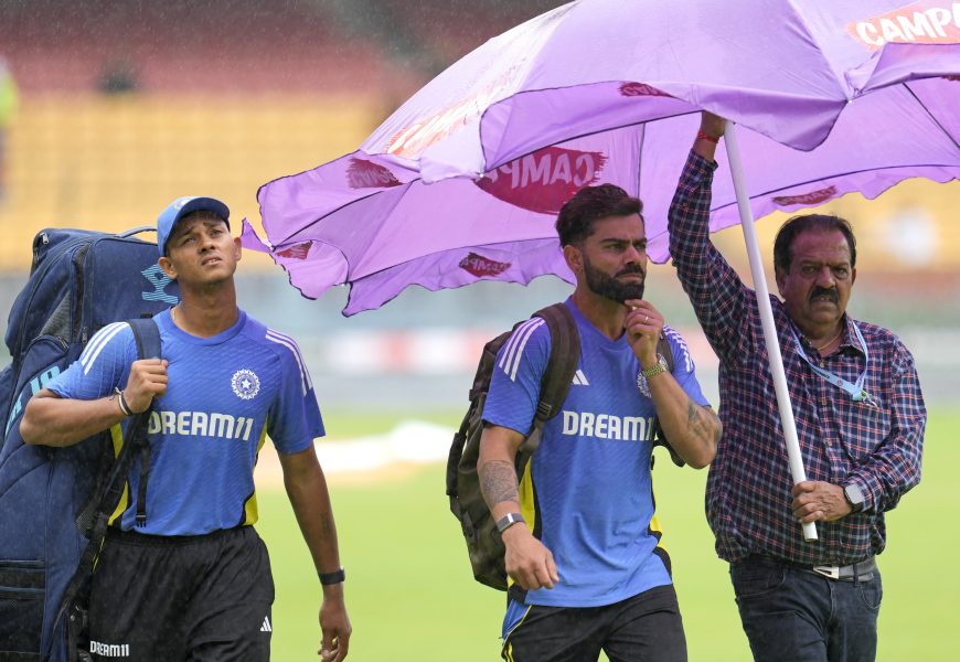 Persistent rain prevented any play on the first day Wednesday after heavy showers in the preceding 48 hours. But play started on time Thursday under cloudy and threatening skies and under lights at M. Chinnaswamy Stadium.