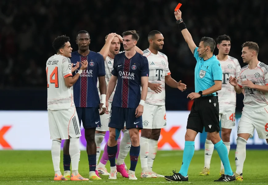 PARIS (AP) – Luis Díaz scored twice for Bayern Munich against Paris Saint-Germain in the Champions League on Tuesday and was then sent off moments before halftime for a reckless foul on Achraf Hakimi.
