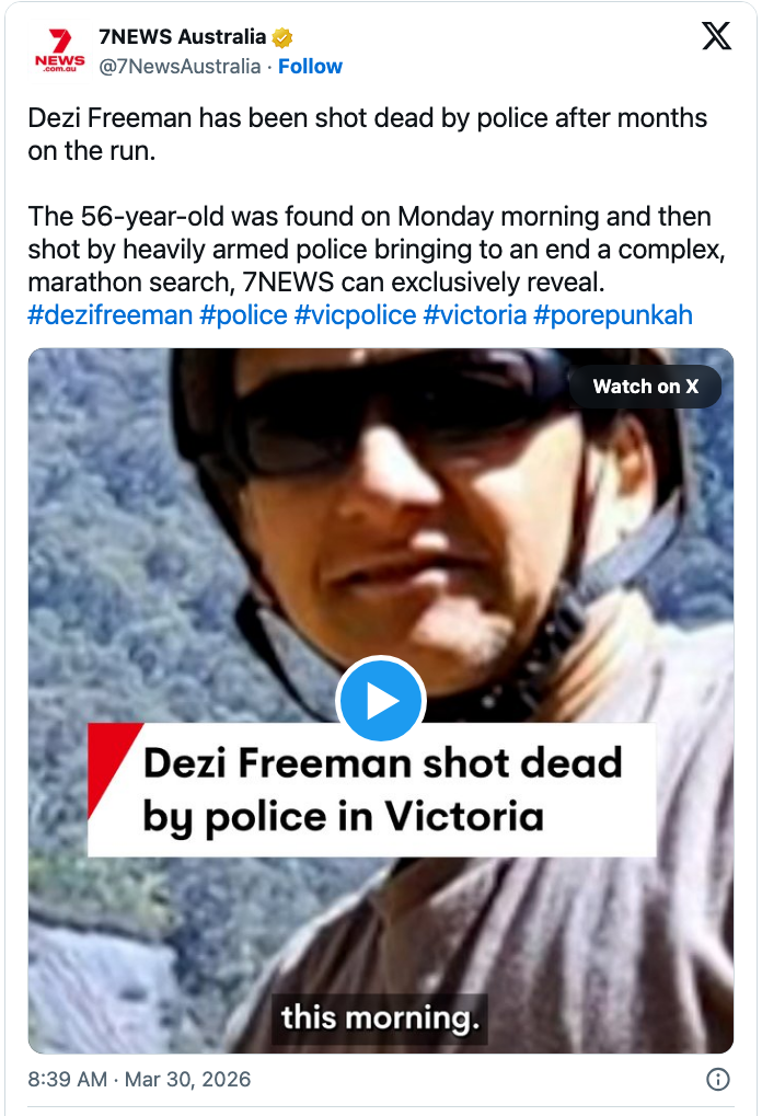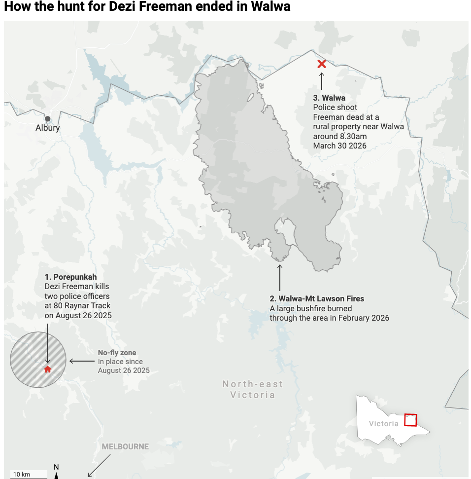 For more than 200 days, police killer Dezi Freeman was on the run in the harsh bush terrain of north-east Victoria after shooting and killing two police officers in August 2025. Freeman was reportedly shot dead by police on Monday morning. Victoria Police Chief Commissioner Mike Bush didn't confirm the identity of the person killed.