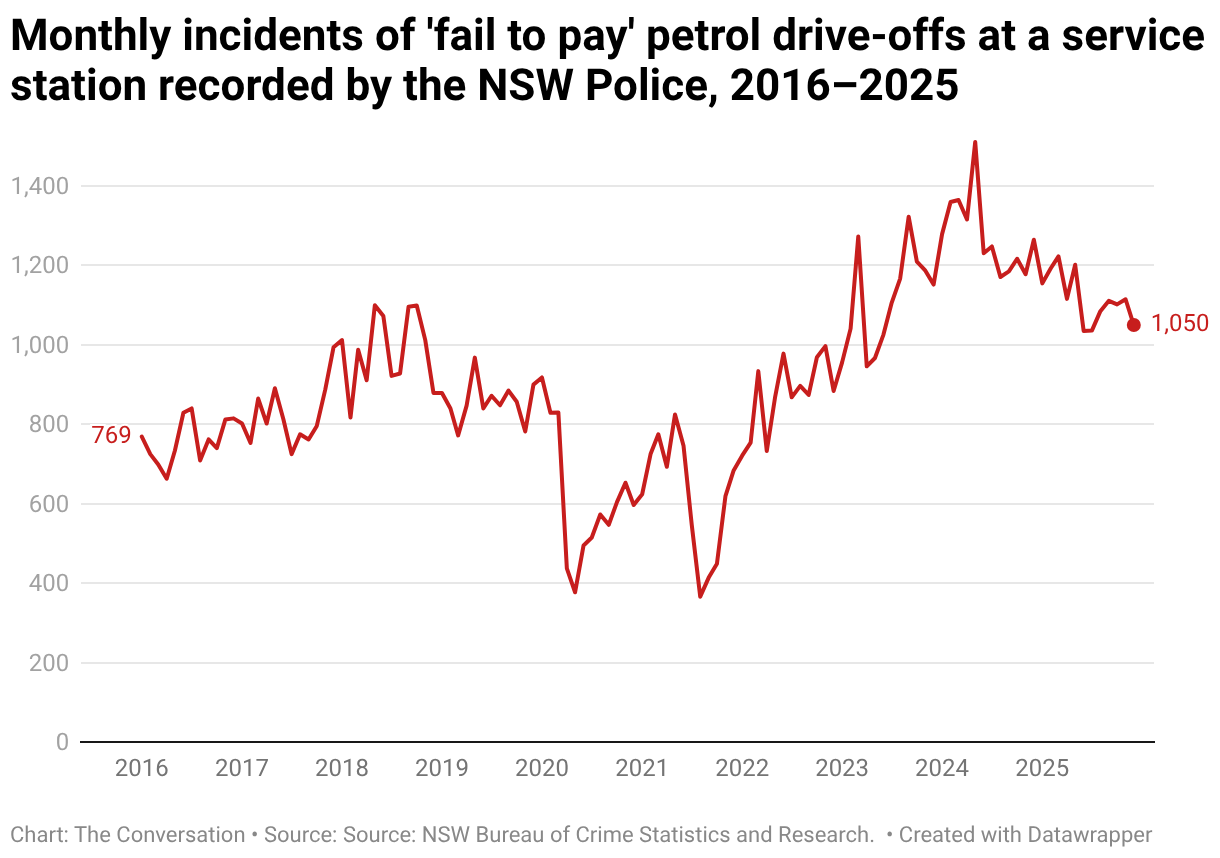 In NSW, figures provided to The Conversation by the state's Bureau of Crime Statistics and Research show "fail-to-pay" drive-offs have risen over the past decade, up from 9,097 in 2016 to 13,423 to the end of 2025, after a peak of 15,326 in 2024.