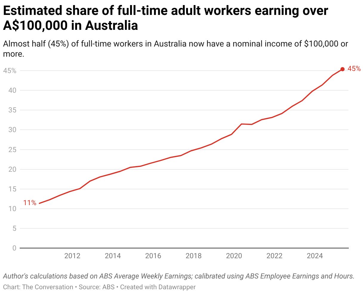 Australians face a huge variety of circumstances, so it's impossible to say a particular wage level is objectively "good". But our estimates suggest that only around one in ten full-time workers in Australia earned $100,000 or more in 2010. By 2025, this had risen to almost one in two, at 45%.