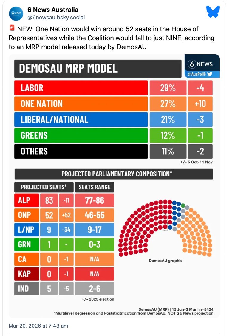 A national YouGov poll for Sky News, conducted March 17-24 from a sample presumably of 1,500, gave Labor 29% of the primary vote (down one since the early March YouGov poll), One Nation 27% (up one), the Coalition 19% (steady), the Greens 13% (steady), independents 6% (up one) and others 6% (down one).