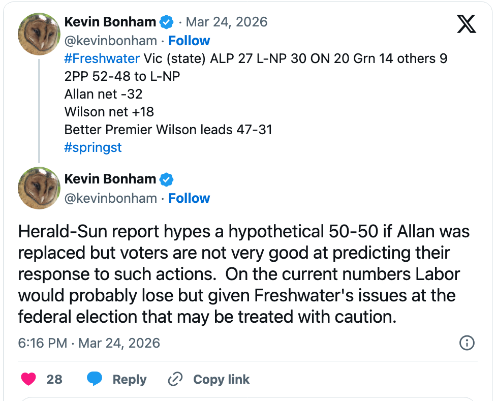 The Victorian state election is in late November. A Freshwater poll for The Herald Sun, conducted March 19-23 from a sample of 1,060, gave the Coalition 30% of the primary vote (up three since the February Freshwater poll), Labor 27% (down one), One Nation 20% (down three), the Greens 14% (up one) and all Others 9% (steady).