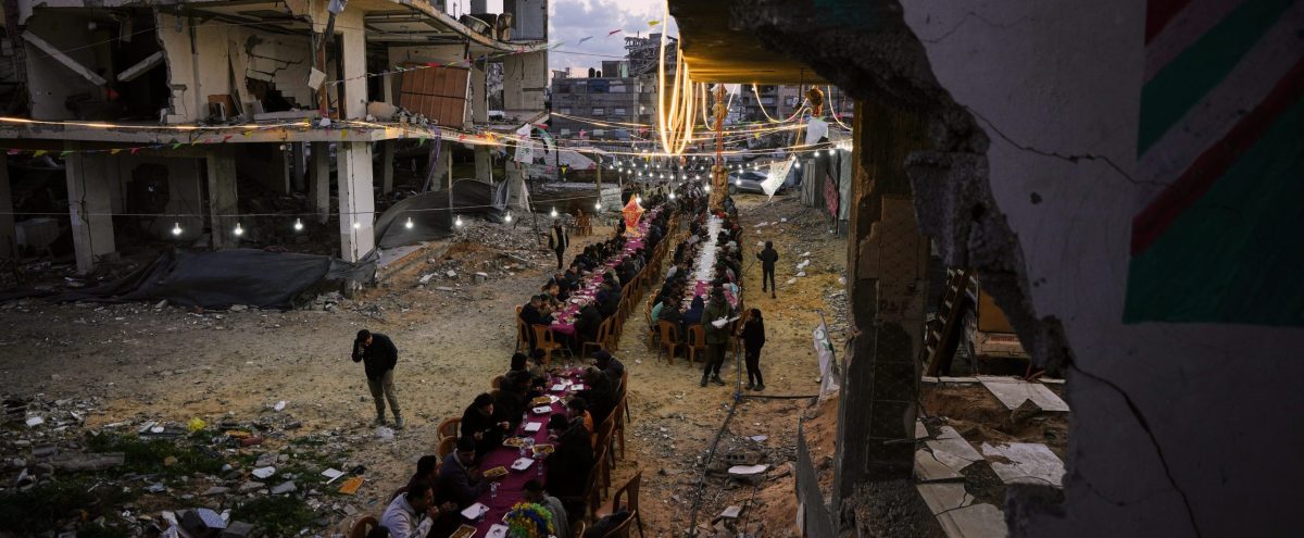 GAZA CITY, Gaza Strip (AP) – As the sun sets, Saddam al-Yazji, his wife and their daughter sip a noodle soup, breaking their daily Ramadan fast in Gaza City. They sit around a folding table set up in the dirt at the foot of a towering pile of rubble, twisted metal and concrete slabs that was once their home.