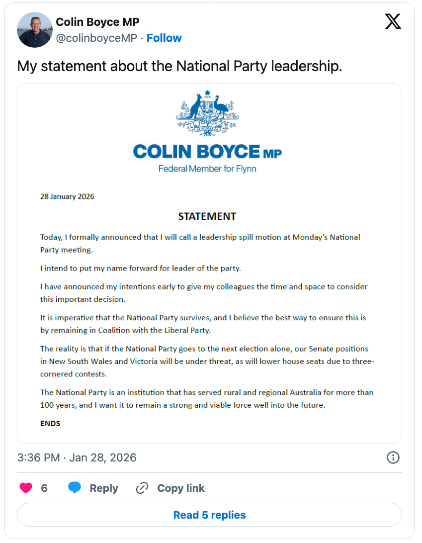 The unsuccessful spill motion at the Nationals meeting came from backbencher Colin Boyce, a strong critic of how Littleproud handled events leading to the Coalition's split that happened less than a fortnight ago. Boyce knew his motion would not succeed but wanted to make a point.