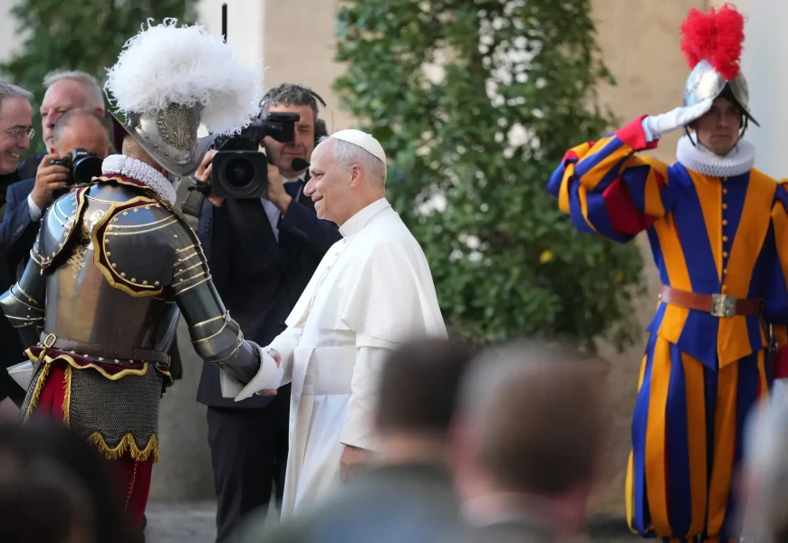 Leo sat in a throne in a courtyard of the Apostolic Palace as the new guards in their distinctive yellow, blue and red “gala uniforms” held their right arm up in a three-fingered salute and pledged “with all my strength, sacrifice and if necessary my life” to defend him and serve him.
