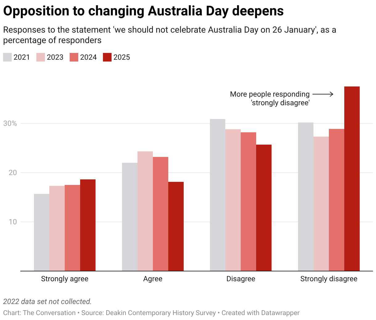 The statement "we should not celebrate Australia Day on 26 January" was included in the Deakin Contemporary History Survey in 2021, 2023, 2024 and late 2025.